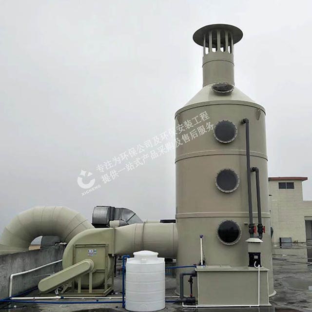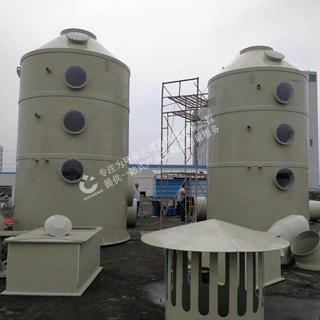 可采用涂裝線漆霧廢氣預處理凈化裝置,pp噴淋塔,漆霧在廢氣中呈懸浮狀,當其通過pp噴淋塔時(此時廢氣在管道中的流速約為8.2m/s),在高速噴射而出的噴淋水作用下,旋轉(zhuǎn)的噴頭(噴頭的旋轉(zhuǎn)速度取決于水量與壓頭),在水力作用下而產(chǎn)生的傘形狀旋轉(zhuǎn)水幕與漆霧充分混合,使原本懸浮于氣體中的漆霧相互碰撞,并迅速增重,最終達到漆霧-廢氣分離的目的,并可使VOC濃度減少50-80%,大幅度減少異味。失去黏性的漆渣進入噴臺循環(huán)水里,定期打撈固廢。